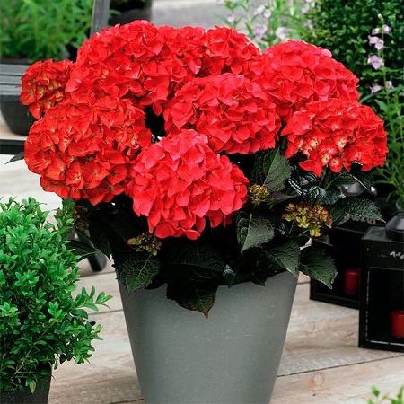 Цветки собраны в соцветия, которые могут быть шаровидной или плоской формы. Богатство и яркость цветов гортензии "Рэд Барон" делают ее незаменимой для создания эффектных цветовых композиций и придания особого очарования саду.