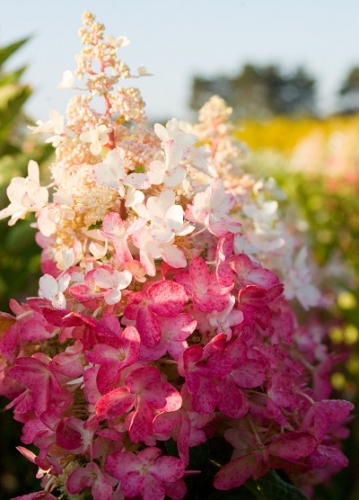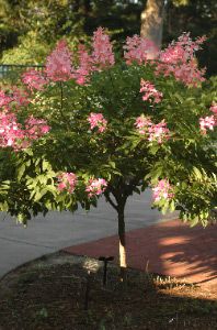 Цветет с июля до сентября. Соцветия с большим количеством стерильных цветков, конические, чисто-белые, затем приобретают пурпурно-розовый оттенок. Листья зеленые, с нижней стороны, опушенные по жилкам, эллиптические с заостренной вершиной и пильчатым краем. Молодые побеги красновато-бурые, немного опушенные. Штамбовая разновидность представляет собой центральный ствол, имеющий длину 80 см, разветвляющийся сверху в форме дерева, высота растения зависит от высоты штамба.
