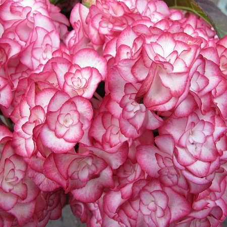 Куст высотой 60-90 см. Соцветия махровые, цветки крупные белые с розовой окантовкой. Сохраняет свою цветовую гамму независимо от кислотности почвы в которой посажен. Время декоративности весьма продолжительное, цветет с июня по сентябрь как на прошлогодних побегах, так и на побегах текущего года.