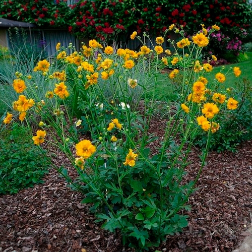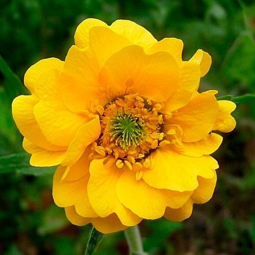 Гравилат чилийский Lady Stratheden — это красивоцветущее растение высотой до 40–60 см. Оно цветёт махровыми жёлтыми цветками диаметром 3–4 см, лепестки которых имеют волнистый край. Цветение длится всё лето начиная с июня. После цветения на растении образуются красивые головки с семенами.