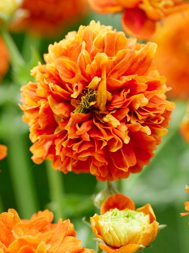 Цветки полумахровые, диаметром 3–4 см, с плотными бархатистыми лепестками, собранными в аккуратную чашу. Каждый цветонос несёт до 5 бутонов, которые раскрываются постепенно, создавая эффект непрерывного цветения. Новые бутоны формируются на протяжении всего лета, особенно активно — если удалять увядшие соцветия. В прохладную погоду цветение может продлиться до августа. Цветки прекрасно выдерживают дождь и солнце, не осыпаются и долго сохраняют форму.