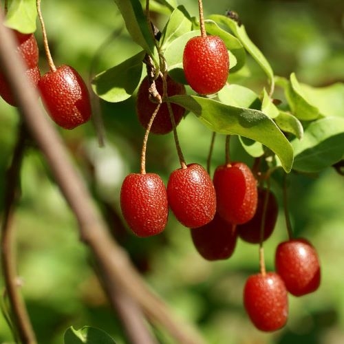 Гуми или лох многоцветковый – это ягодный кустарник. Ценится своими плодами, богатыми полезными веществами и эффектным внешним видом в период цветения. В высоту достигает 1,2-2 м. В конце мая-начале июня появляются цветы, по форме напоминающие колокольчики, они однодомные, мелкие, нежно-кремового цвета, источают сильный аромат, привлекающий пчёл. В конце июня-начале июля не равномерно, на протяжении трёх-четырёх недель, созревают продолговатые плоды – ягоды, до 2 см в длину, красного цвета с мелкими светлыми крапинками на длинных плодоножках, внутри имеется небольшая косточка. Созревшие ягоды могут находиться на ветках до самых морозов, по вкусу они кисловато-сладкие, напоминают одновременно вишню, ананас, яблоко, виноград и хурму. Средняя урожайность – от шести до восьми кг с куста. Гуми - медленно растущее растение, приносить плоды начинает только на пятый-шестой год после посадки. Может выдерживать морозы до - 30°С Гуми светолюбивый кустарник. Для его выращивания нужны хорошо освещённые, плодородные участки, защищённые от сильных порывов ветра. Лох предпочитает супесчаные или суглинистые почвы со слабой или нейтральной кислотностью. Гуми не даёт корневых отпрысков и не расползается по всему участку.