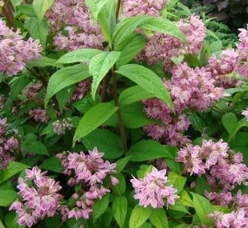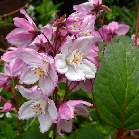 Пышный кустарник высотой 120-150 см. Крона густая и ветвистая. Стебли гибкие, прямые. Листва темно-зеленого тона, широкая, яйцевидной формы и немного мятая. Цветет крупными цветочками, которые собраны в пышные кисти. Лепестки цветов белого тона с розовым окрасом на концах. Цветение обильно. Период цветения май-июнь.