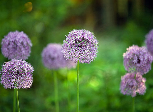 Зонтик (соцветие) крупный, диаметром до 20 см, почти шаровидный, рыхлый, очень многоцветковый. Цветки звездчатые, с острыми (узкими) 6 лепестками, фиолетовые, оттенок зависит от сорта. Цветет в июне, продолжается 1-1,5 месяца,, после чего листья отмирают до следующей весны.