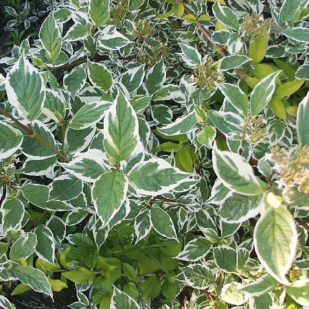 Декоративный в течение всего сезона кустарник. Высота до 2,5 м. Неповторимо нарядным этот сорт делает широкая сербристая кайма по краю листовой пластинки и ярко-красная окраска коры. Цветки белые, собраны в щитковидные соцветия диаметром 3-5 см. Плоды - сочные шаровидные синевато-белые ягоды.