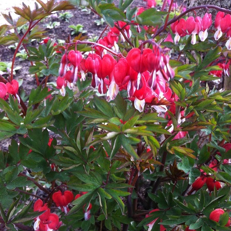 Многолетнее травянистое растение высотой 50–70 см. У него крупные рассеченные листья ярко-зеленого цвета, создающие красивый фон для цветов. Цветки в форме сердца имеют насыщенный розовый цвет с белым краем и собраны в висячие соцветия. Растение цветет с апреля по июнь и привлекает внимание в саду.