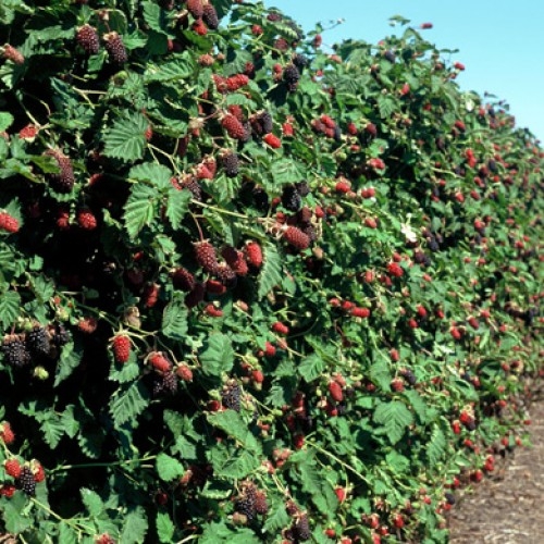 Побеги стелющиеся, бесшипные, высота до 3 м. Листья светло-зеленые, перистые, симметричные, зубчатые, заостренные. Ягоды овальной формы, крупные до 10 гр., созревают в конце июля-начале августа, темно-вишневые, при полном созревании практически черные, сочные, нежные. Костянка без глянца, хорошо сцеплена, при полном созревании отрыв легкий. Вес в среднем10-12 г, на взрослых 5-6 летних растениях и более. Плоды собраны в вислые кисти по 5-6 шт., на начальном этапе зеленые, затем краснеют, принимают темный цвет. Вкус изысканный, тонкое переплетение ежевично-малинных ноток, с интенсивным ароматом, очень сладкая – лучший в своем классе. Урожайность в сравнении с ежевикой средняя, на уровне малины.