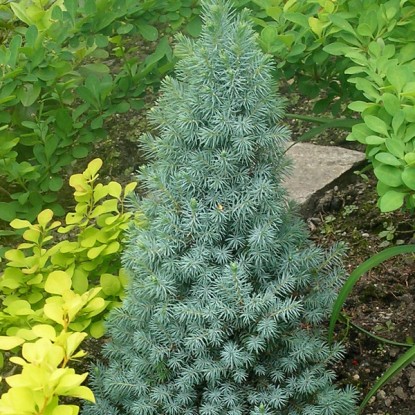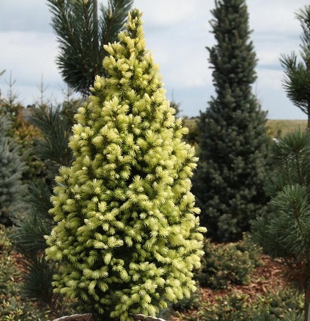 Ель конической формы, очень плотная. Высота в наших условиях обычно не превышает 120 см. Весной молодой прирост очень красивый, бело-кремовый оттенок, который постепенно в течение сезона переходит в светло-синий или голубовато-зелёный.