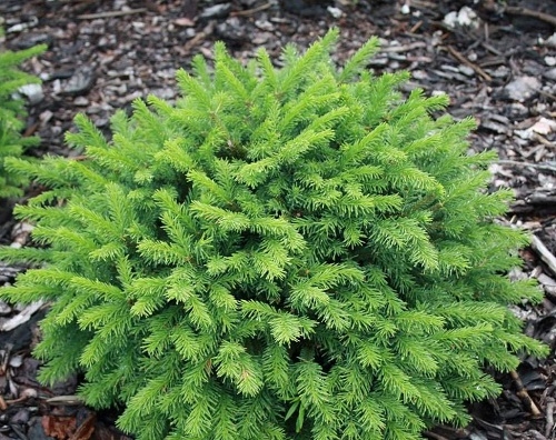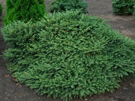 Карликовый сорт ели. Молодые деревья имеют округлую форму кроны, но с возрастом она становится раскидистой. Ветви растут густо. Хвоя короткая, густая, длиной 10-12 мм, узкая и уплощённая, зелёная с белыми утьицами, которые придают растению синеватый оттенок. Растёт медленно, к 10-ти годам высота около 1 м и диаметр 2 м. Название латинское: Picea abies 'Pumila Glauca' Особенности выращивания: любит солнечное местоположение и влажную рыхлую в меру плодородную почву. Применение: Рекомендуется для садовых композиции с другими карликовыми хвойными и листопадными деревьями и кустарниками, с цветами и растениями с декоративными листьями. Кроме того карликовые елочки неподражаемо подчеркивают красоту роз.