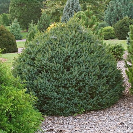Карликовая форма ели высотой до 3,5 м, растет медленно, годовой прирост в высоту 35 см, в ширину 15 см. Крона ширококоническая, очень густая неравномернгая. Стебли короткие жесткие. Хвоя плотная, расположена на побеге радиалыю, сверху желто-зеленая, снизу - голубого цвета, 5-10 мм длиной, 1,5 мм шириной. Шишки коричневого цвета, длиной до 6 см. Название латинское: Picea omorika 'Nana'