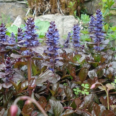 Многолетнее растение до 15 см высотой. Листья, коричнево-пурпурные с бронзовым отливом. Осенняя краска более яркая. Цветет сиреневыми цветками в мае-июне.