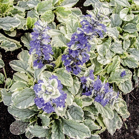 Многолетник со стелющимися и укореняющимися побегами, стебель высотой 10 - 25 см. Листья прикорневой розетки сужены в длинный черешок, стеблевые — сидячие или короткочерешковые, со слегка волнисто-выемчатыми краями. Цветки в пазушных мутовках (по 6 - 8), образующих колосовидное соцветие. Венчик синий или голубой, снаружи опушенный. Листья серовато-серебристо-зеленые имеют неравномерно окрашенную по краю белую или кремовую полосу. Цветет в мае — июне в течение 20 дней.