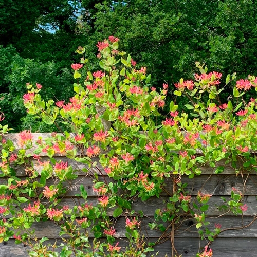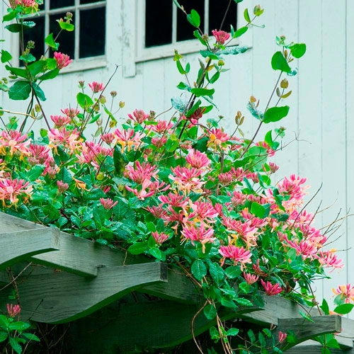 Вьющаяся лиана (до 300-400 см) с сине-зелёными сросшимися листьями. Цветки трубчатые (4-5 см), двугубые, наружная сторона розово-оранжевая, внутренняя – золотисто-жёлтая, собраны в верхушечные мутовки, источают интенсивный вечерний аромат; цветение с июня по сентябрь.