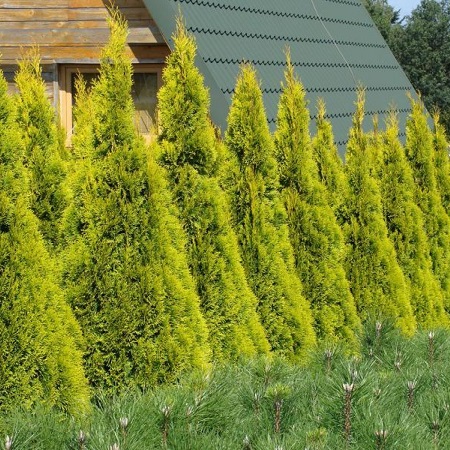 Это наилучшая форма популярного сорта Смарагд. Практически идеально коническая крона имеет золотисто-желтую крону, цвет которой неизменен на протяжении всего года. Хвоя чешуйчатая, нежная на ощупь, густая, желто-зеленого цвета, на кончиках побегов ярко-золотистая. При распускании молодые хвоинки имеют оранжевый оттенок. Побеги сравнительно короткие, уплощенные. К 10 годам высота растения достигает 2 м.