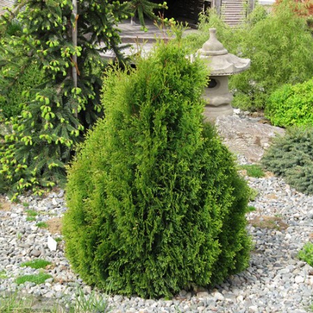 Применение: Строгая конусовидная форма, которая не нуждается в декоративной формировке, прекрасно смотрится одиночным растением на газоне, в пестром миксбордере, в контрастной ландшафтной композиции из деревьев и кустарников с различной архитектурой.
