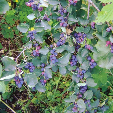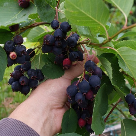 Дорастает до 5 м в высоту, крона широкая, раскидистая, образует много стволов. Растение цветёт рано, урожай созревает уже в конце июня. Плоды крупные, по цвету темно-синие с восковым налетом диаметром 1,7–1,8 см, сладкие, с лёгкой кислинкой. Мякоть очень сочная. Плодоношение растягивается на несколько недель. Среднепоздний период созревания. Сорт самоплодный. Название латинское: Amelanchier alnifolia "Thiessen " Особенности выращивания и ухода: Ирга предпочитает солнечные, хорошо освещенные места. К почвенным условиям нетребовательна, устойчива к недостатку влаги и к некоторому переувлажнению. Использование: Универсальное растение, рекомендуется использовать на приусадебных участках и групповых посадках в парках. Из спелых плодов готовят варенье, желе, пастилу, кисель и высококачественное вино приятного вкуса и красновато-фиолетового цвета. Неплохо смотрится в ландшафтном дизайне в группах с шиповником, барбарисом и спиреями. Дополнительные комментарии: Санитарная обрезка состоит в вырезке сухих и поврежденных ветвей и корневой поросли. Достоинства сорта: крупноплодность, зимостойкость, засухоустойчивость и противостояние вредителям и болезням, самоплодность.