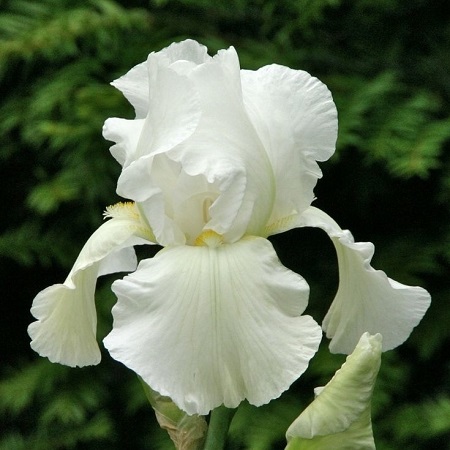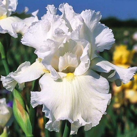 Высота и ширина 40-50 см. Листья прикорневые, линейные, собраны в основании в вееровидные пучки. Цветок белого однотонного цвета. Края лепестков волнистые, а бородка посередине светло-желтого цвета. Растение образует от 1 до 7 цветков размером 10-15 см в диаметре. Цветёт в июне-июле. Цветение длится от 4 до 6 недель, продолжительность жизни цветка составляет до 5 дней.