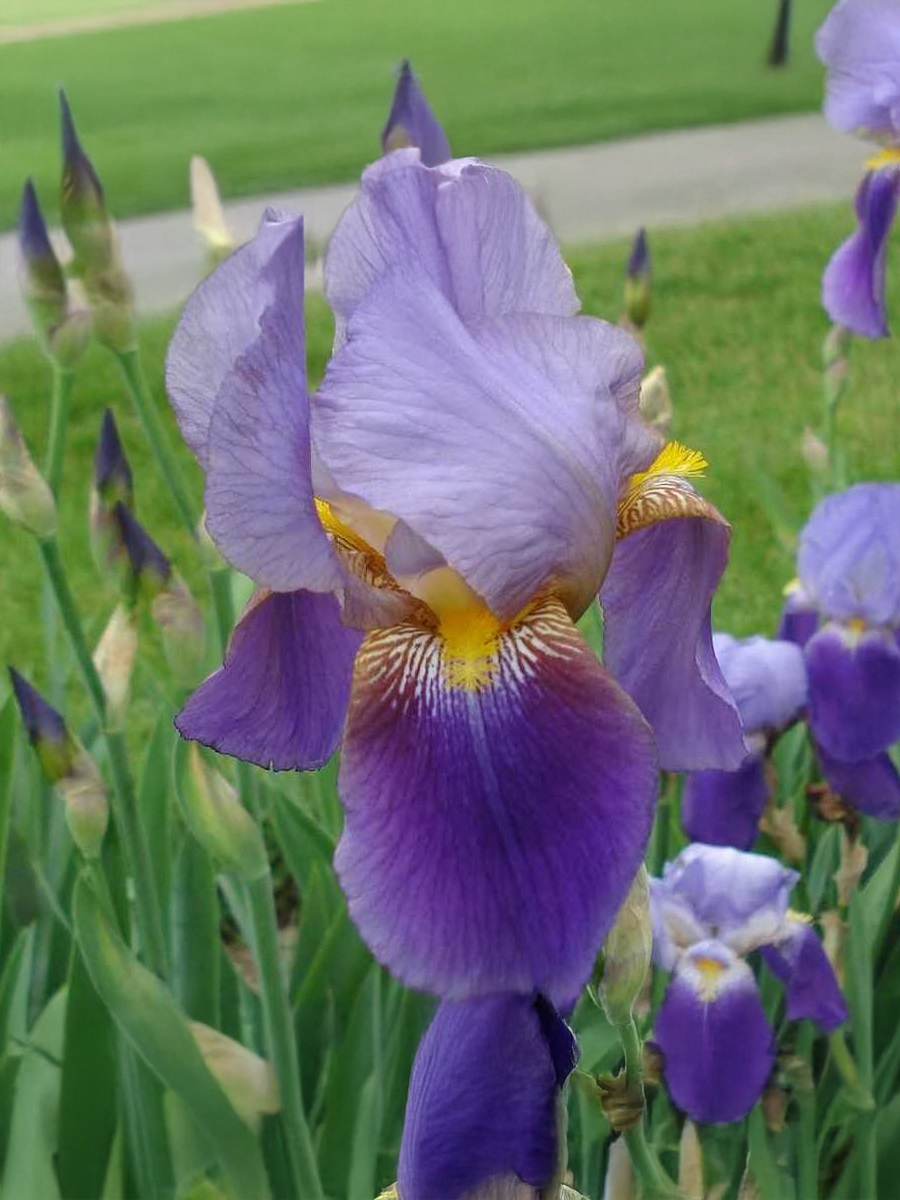Ирисы германские Lent A Williamson (Лент А Уильямсон) — эффектный двухцветный сорт с выразительным контрастом лепестков. Растение формирует куст высотой 70–90 см и шириной до 50–70 см. Цветки крупные, около 10–12 см, с классической «ирисовой» формой: верхние лепестки (стандарты) нежно-сиреневые с лёгким лавандовым оттенком, а нижние (фолы) — насыщенно-фиолетовые с бархатистой текстурой. В центре — яркая жёлтая бородка с характерным бело-фиолетовым жилкованием, создающим эффект свечения.