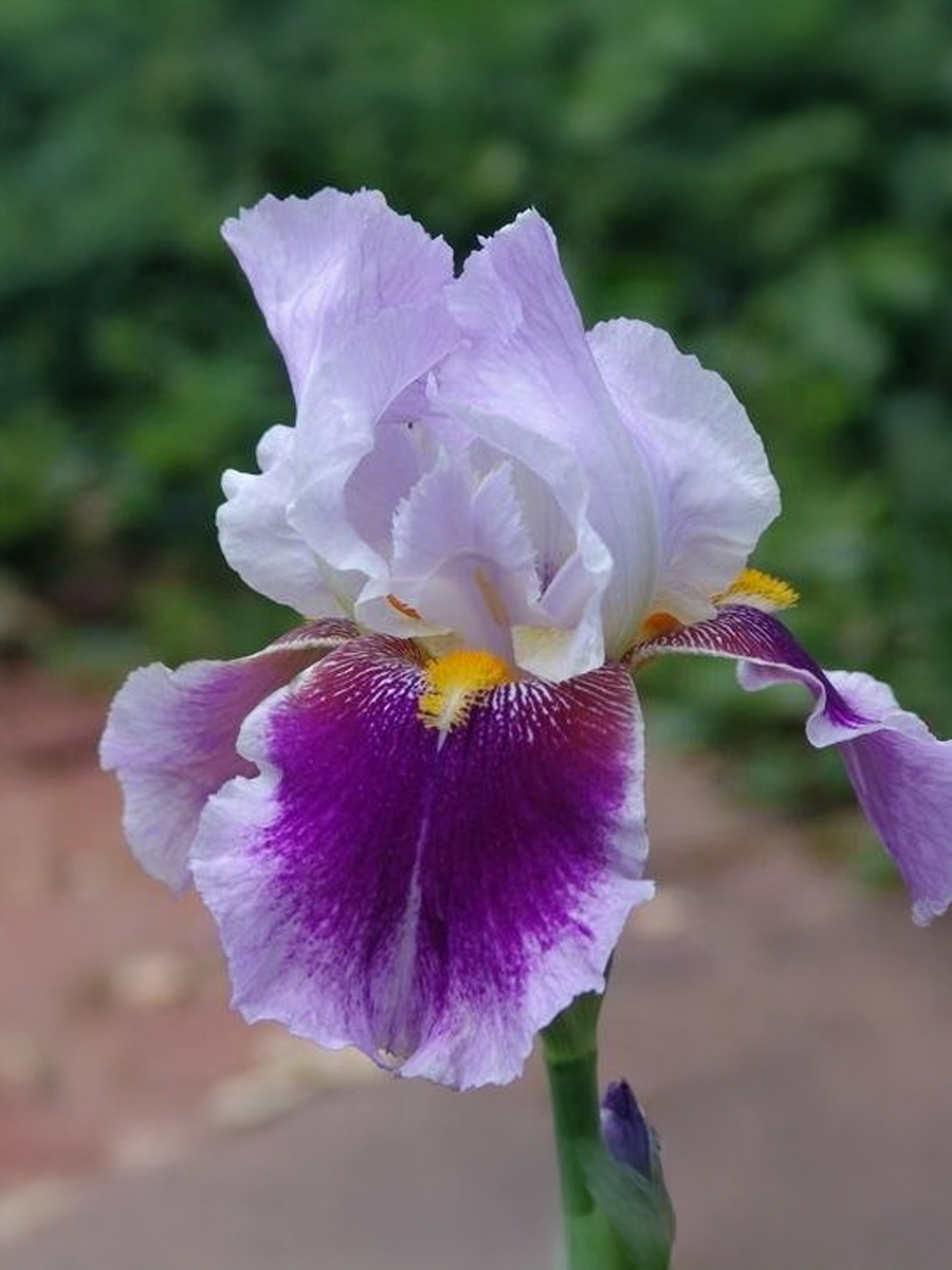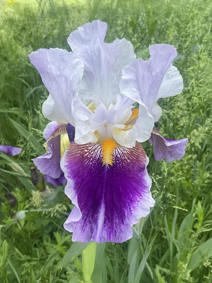 Ирисы германские Silver Peak (Сильвер Пик) — выразительный контрастный сорт с эффектной игрой холодных и насыщенных оттенков. Формирует мощный куст высотой 80–100 см и шириной до 50–70 см. Цветки крупные, около 10–12 см, с изящно волнистыми лепестками: верхние лепестки (стандарты) почти белые с лёгким голубовато-сиреневым отливом, а нижние (фолы) — насыщенно-фиолетовые с мягким переходом цвета и светлым жилкованием ближе к центру.