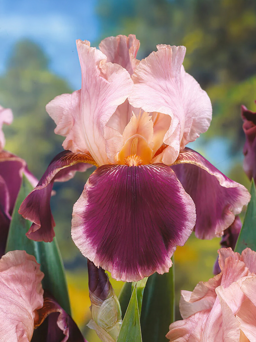 Ирисы германские Wine and Roses (Вайн энд Роузес) — эффектный контрастный сорт с благородным сочетанием нежных и насыщенных оттенков. Куст формирует мощную вертикаль высотой 80–100 см и шириной до 50–70 см. Цветки крупные, около 10–12 см, с выразительно волнистыми лепестками: верхние лепестки (стандарты) мягкого розово-персикового оттенка, а нижние (фолы) — насыщенно винно-бордовые с бархатистой текстурой. В центре яркая оранжевая бородка создаёт тёплый акцент и усиливает глубину цвета.