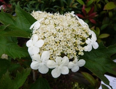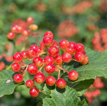 Медленно растущий компактный кустарник с округлой кроной, высотой до 1,5м и диаметром до 2м. Годовой прирост 10 см. Цветет обильно в мае - июне, белыми цветками собранными в плоские зонтики - посередине двуполые, снаружи неплодоносящие. Листья светло-зеленые, с нижней стороны бледно-зеленые, опушенные, 3-5 лопастные, от 4 до 8см. Осенью листва окрашивается в оранжево-красные тона. Съедобные плоды кораллово- красные, блестящие, до 1см в диаметре, собраны в многочисленные грозди, удерживаются на растении с августа до ноября.