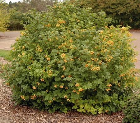 Высотой до 1,5 м, ширина до 2 м, вертикальнорастущие побеги формируют овальную крону. Листья лопастные 3-5 шт., светло-зеленые. Цветки собраны в щитках, свойственные виду. Плоды ярко-желтые, блестящие, крупные, съедобные. Корневая система разветвленная стержневая.