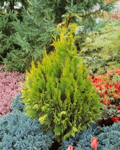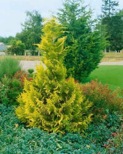 Вечнозеленый кустарник который может достигать высоты от 3 до 5 метров, но иногда может вырасти и до 10 метров. Его сучья расположены далеко друг от друга и образуют ярусы. Ветви у этого деревца тонкие и многочисленные, а их кончики имеют желтый цвет и немного опущены. Ветки также тонкие, перьевидные и имеют желто-золотой цвет. Иголки у этого деревца сверху золотисто-желтые, внутри дерева они более зеленовато-желтые, а внизу они желто-зеленые. Название латинское: Chamaecyparis lawsoniana Darts Blue Ribbon Особенности выращивания и ухода: К почвам не требователен, растет как на кислых, так и на слабощелочных почвах, влажных или сухих, чувствителен к уплотнению и задернению верхнего горизонта почвы. Как и все вечнозелёные не переносит пересыхания почвы. Местоположение при посадке - солнечное или в полутени. Применение: Является популярным выбором для ландшафтного дизайна благодаря своей красивой форме и насыщенному цвету хвои. Оно также известно своей устойчивостью к болезням и вредителям.