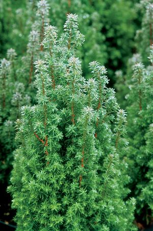 Это небольшой кустарник 140-150 см в высоту и 40-60 см в ширину. Ежегодный прирост достигает 6-7 см. Крона плотная, колоновидная или коническая. Живет 60 лет и более. Хвоя мягкая, голубовато-зеленая, короткая. Весной хвоя становится серебристо-голубой, осенью - медно-бронзовой. Шишечки мелкие.