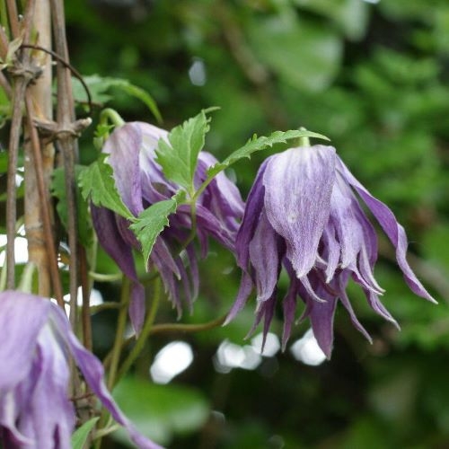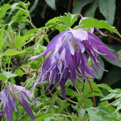 Вьющееся растение, цепляется за опоры листовыми хвостиками. Вырастает до 2,5–3 м в высоту. Цветки среднего размера, диаметром 7-9 см, махровые и полумахровые, сине-фиолетовыми и белые у основания, колокольчатые. Они состоят из 4 слегка волнистых заостренных чашелистиков и 12-26 стаминодий. Тычинки с желтыми пыльниками на кремово-зеленых нитях. Наиболее обильно цветет в мае-июне. Листья сложные тройчатые с зубчатыми краями. Высота обрезки 1 (без обрезки)