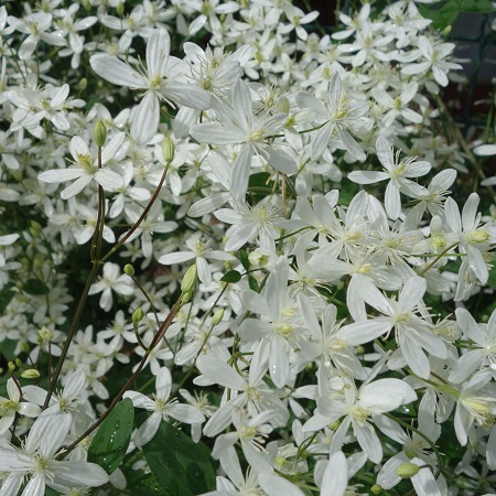 Лиана высотой до 3,5 м. Цветки мелкие, диаметром до 3 см, белые, собранные в многоцветковые соцветия. Цветение очень обильное. Кроме этого цветы имеют приятный аромат. Цветет в июле-августе. После цветения на растении образуется множество пушистых соплодий, которые долго держаться на растении и украшают сад осенью и ранней зимой.