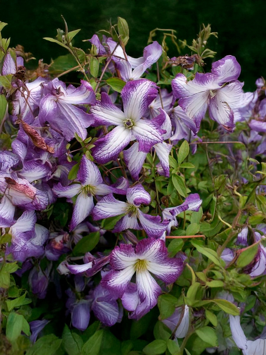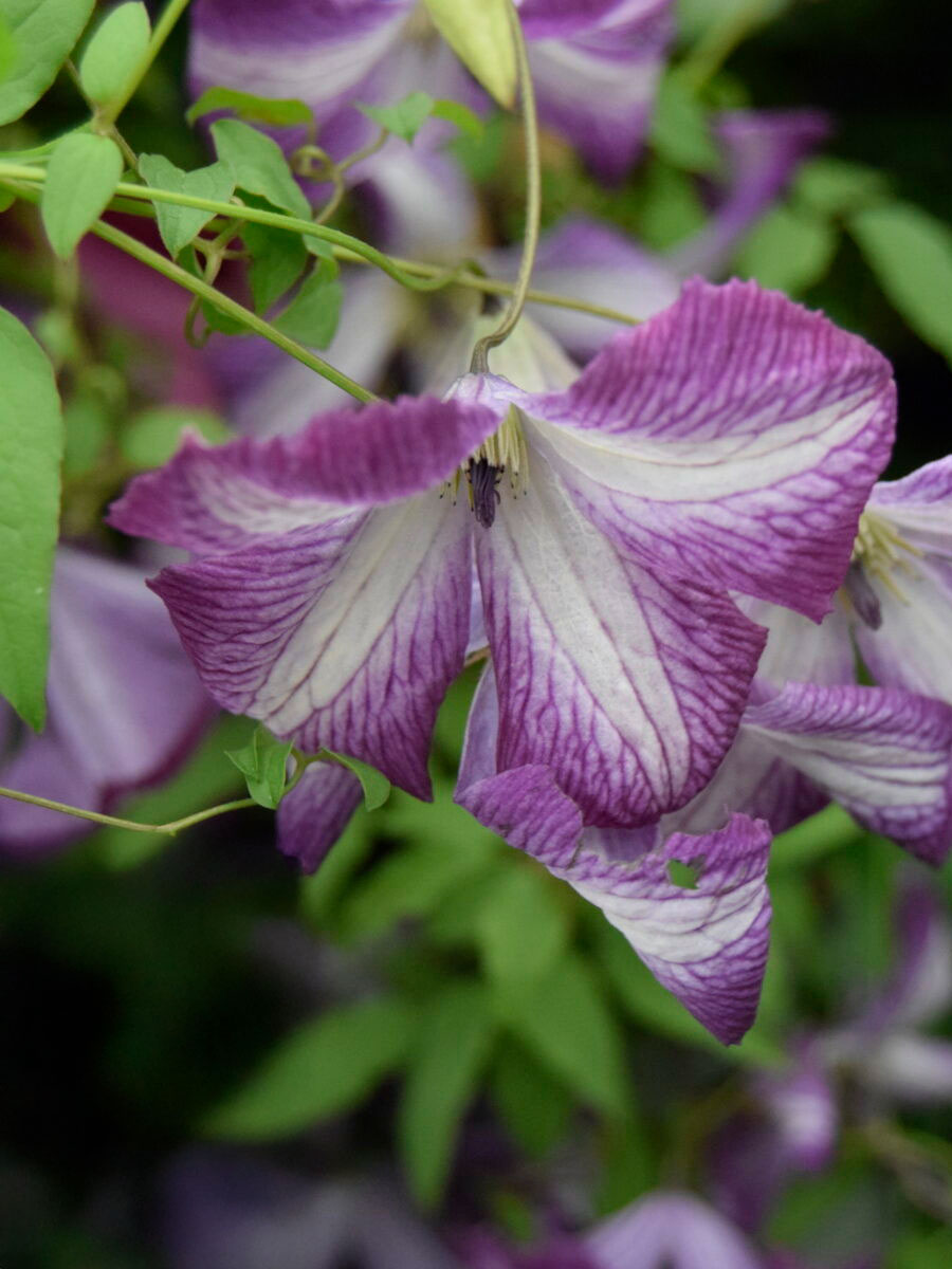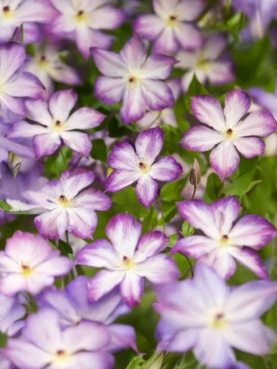 Клематисы I am Lady J — очень изящные многолетние саженцы для вертикального озеленения, которые ценятся за необычную окраску и лёгкий, романтичный облик. Сорт относится к группе Viticella и формирует элегантную лиану высотой примерно 2,5–3 м, а в хороших условиях может вырастать и до 4 м. Цветки небольшие, около 5–6 см, раскрываются как колокольчики, а затем становятся более звёздчатыми. Основная окраска светлая, белая или беловатая, с яркой фиолетово-пурпурной каймой по краям лепестков.