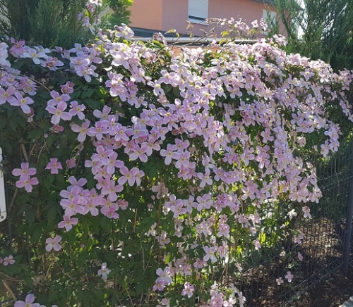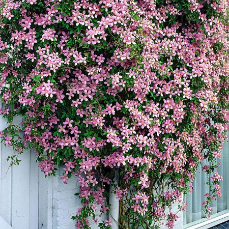 Травянистая лиана высотой от 6 до 10 м. Цветение обильное в мае-июне и повторно в июле-сентябре. Побеги пурпурного окраса, соцветия мелкие, до 6 см в диаметре, в одном бутоне формируется 4 лепестка розового цвета. Диаметр цветка до 5 см., обладают приятным ароматом ванили. Название латинское: Clematis montana "Rubens"