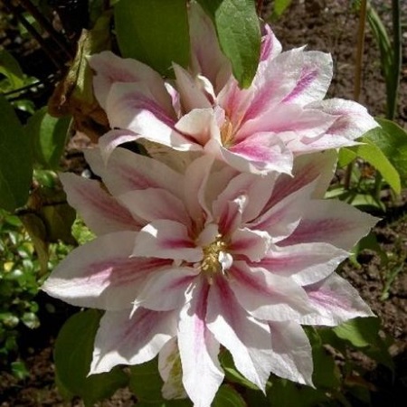 Умереннорастущий сорт с двуцветными цветками. Лепестки кремово-розовые, а по середине пробегает яркая розовая полоска. Тычинки жёлтые. В мае-июне цветки полумахровые, в сентябре- одиночные. Не любит очень солнечных и жарких мест. Особенно подходит для выращивания у решёток, сеток и других садовых опор. Может виться по натуральным опорам, напр. лиственным или хвойным кустарникам, полукустарникам.