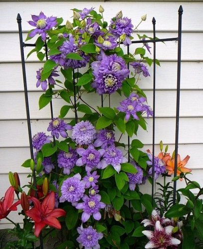 Применение: Сажают вдоль заборов, вокруг беседок, рядом с другими декоративными кустарниками, или же при посадке следует сразу установить опору для клематиса ("обелиск", решетку и подобное сооружение). Подвязывать стебли клематиса к опорам следует равномерно в одни слой: это обеспечивает лучшее освещение и в дальнейшем более сильное цветение клематиса.