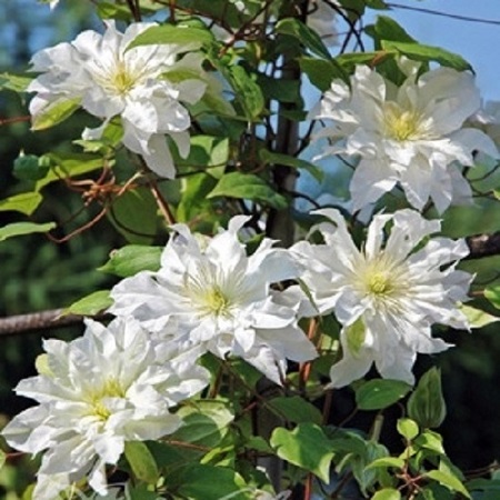 Крупные цветки, диаметром 10–15 cм, с 20–30 слегка волнистыми белыми чашелистиками и стаминодиями, жёлтые пыльники на белых нитках и светло-жёлтые столбики. Цветёт как на побегах текущего года, так и на прошлогодних. Цветки появляются на высоте около 1 м. от основания. Листья светло-зелёные, края ровные, простые, сердцевидные, тройчатые, листочки овальные, заострённые.