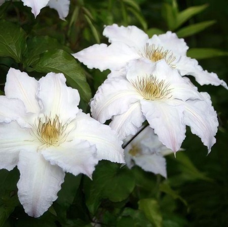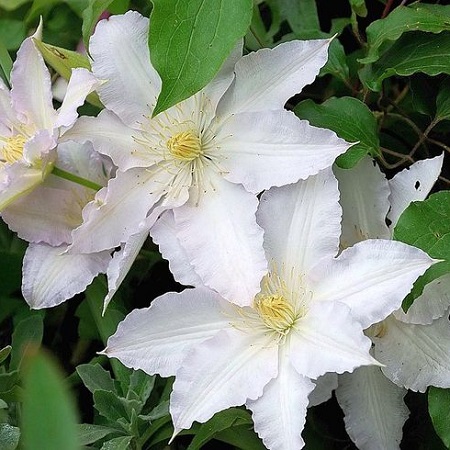 Крупноцветковый клематис с очень крупными цветками от белого до бледно-жемчужно-розового цвета с декоративно волнистыми лепестками, цветки крупные 15-20 см в диаметре. Цветет как на прошлогодних побегах, так и на побегах этого года. Цветет конец мая – июль и повторяет цветение, но уже более скромно – в сентябре. Растет компактно, достигает высоты 2-3 м. Особенности выращивания:Уход за клематисами включает в себя обрезку, прикрепление к опорам, подкормки и мульчирование, а холодных регионах еще и укрытие на зиму. Хорошо растут на щелочных, нейтральных почвах или на почвах со слабокислой реакцией. Расстояние между клематисами от 70 см до метра. Клематисы не выносят переувлажнения и застоя воды. После того, как вы посадили клематис, обильно полейте его, для лучшего доступа воды и препятствования размытию почвы можно сделать вокруг растения лунку. Неплохо промульчировать почву опилками или торфом. Саженец нужно притенить от прямых солнечных лучей. Сажать клематис рекомендуется на хорошо освещённом, защищённом от ветра месте.