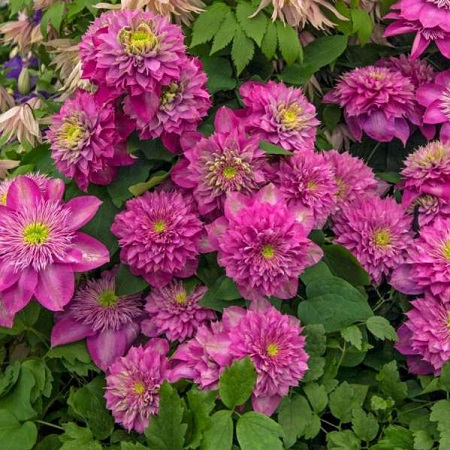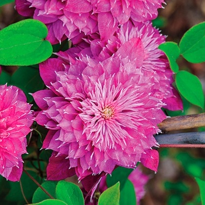 Очень привлекательный японский сорт с махровыми цветами розового цвета. Диаметр цветов 10-14 см, с многочисленными чашелистниками от эллиптических вплоть до узких – иглообразных, ярко розовых, иногда почти красных, в холодное время местами становятся зелеными. Тычинки и стаминодии имеют зеленоватую окраску, в период полного цветения розоватую. Цветет обильно с мая по июнь. Цветки покрывают плотно полностью все растение. Листья светлозеленые, состоят чаще всего из трех эллиптических остро законченных листочков. Достигает высоты 1-1,5 м. Цепляется за опоры черешками листьев. Лучше всего высаживать около обелисков, невысоких садовых опор и решеток. Пригодна для возделывания в контейнерах.