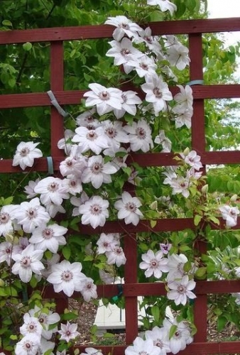 Лиана, с вьющимися побегами, вытягивающимися в длину до 3 м. Крупноцветковый клематис. Соцветия плоские, восьмилепестковые, диаметром 15-16 см. Доминирующий окрас – молочный, с видимо проступающей дорожкой по центру. На контрасте выступает тычинистая сердцевина, насыщенно-бордового цвета. Отличается ремонтантным цветением. Первая волна приходится на июнь, когда у растения зацветают побеги прошлого года, вторая — на июль-август. В это время цветы распускаются на побегах текущего года. Особенности выращивания:Уход за клематисами включает в себя обрезку, прикрепление к опорам, подкормки и мульчирование, а холодных регионах еще и укрытие на зиму. Хорошо растут на щелочных, нейтральных почвах или на почвах со слабокислой реакцией. Расстояние между клематисами от 70 см до метра. Клематисы не выносят переувлажнения и застоя воды. После того, как вы посадили клематис, обильно полейте его, для лучшего доступа воды и препятствования размытию почвы можно сделать вокруг растения лунку. Неплохо промульчировать почву опилками или торфом. Саженец нужно притенить от прямых солнечных лучей. Сажать клематис рекомендуется на хорошо освещённом, защищённом от ветра месте. Применение: Сажают вдоль заборов, вокруг беседок, рядом с другими декоративными кустарниками, или же при посадке следует сразу установить опору для клематиса ("обелиск", решетку и подобное сооружение). Подвязывать стебли клематиса к опорам следует равномерно в одни слой: это обеспечивает лучшее освещение и в дальнейшем более сильное цветение клематиса.