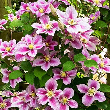 Особенности выращивания:Уход за клематисами включает в себя обрезку, прикрепление к опорам, подкормки и мульчирование, а холодных регионах еще и укрытие на зиму. Хорошо растут на щелочных, нейтральных почвах или на почвах со слабокислой реакцией. Расстояние между клематисами от 70 см до метра. Клематисы не выносят переувлажнения и застоя воды. После того, как вы посадили клематис, обильно полейте его, для лучшего доступа воды и препятствования размытию почвы можно сделать вокруг растения лунку. Неплохо промульчировать почву опилками или торфом. Саженец нужно притенить от прямых солнечных лучей. Сажать клематис рекомендуется на хорошо освещённом, защищённом от ветра месте.
