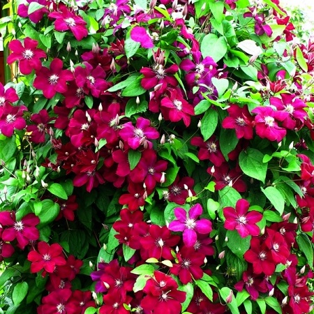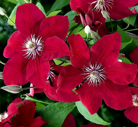 Период цветения с июля по сентябрь. Цветение очень обильное и продолжительное. Растение вьющееся, высокорослое ( до 3 метров). Цветки крупные до 10 см. в диаметре, тёмно-красного цвета с белыми тычинками. На зиму этот сорт клематиса требует слабой обрезки. Высадку производят на солнечных или тенистых участках земли, хорошо защищенных от ветра. Подходит для выращивания: на балконах, в контейнерах, на террасах и т.д. Высаживается у беседок, арок, решеток, заборов, пергол и любых других садовых опор. Может виться по натуральным опорам: деревьям, кустарникам.