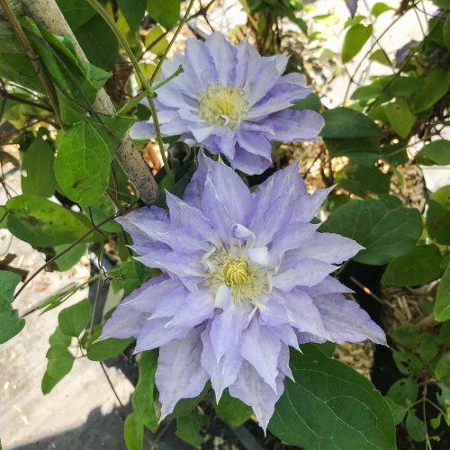 Интересный сорт с махровыми, полумахровыми и простыми цветками диаметром около 12 см с многочисленными волнистыми светло-фиолетовыми чашелистиками и более светлой полоской посередине. Тычинки с желтыми пыльниками на кремовых нитях. Цветет во второй половине мая и в июне, а после обрезки отцветших цветков может повторно цвести и в сентябре. Цветки вторичного цветения чаще простые. Достигает высоты 2,5-3 м. За опоры цепляется листовыми черешками. Высота обрезки - 2 (слабая). Особенности выращивания:Уход за клематисами включает в себя обрезку, прикрепление к опорам, подкормки и мульчирование, а холодных регионах еще и укрытие на зиму. Хорошо растут на щелочных, нейтральных почвах или на почвах со слабокислой реакцией. Расстояние между клематисами от 70 см до метра. Клематисы не выносят переувлажнения и застоя воды. После того, как вы посадили клематис, обильно полейте его, для лучшего доступа воды и препятствования размытию почвы можно сделать вокруг растения лунку. Неплохо промульчировать почву опилками или торфом. Саженец нужно притенить от прямых солнечных лучей. Сажать клематис рекомендуется на хорошо освещённом, защищённом от ветра месте. Применение: Сажают вдоль заборов, вокруг беседок, рядом с другими декоративными кустарниками, или же при посадке следует сразу установить опору для клематиса ("обелиск", решетку и подобное сооружение). Подвязывать стебли клематиса к опорам следует равномерно в одни слой: это обеспечивает лучшее освещение и в дальнейшем более сильное цветение клематиса.