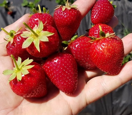 Один из самых перспективных ремонтантных сортов американской селекции. Выделяется крупноплодностью: ягоды достигают 35–50 г, сохраняют размер в течение всего сезона. Форма ширококоническая, выровненная, поверхность глянцевая, насыщенно-красная — привлекает внимание на витрине и отлично продаётся. Мякоть плотная, но не твердая, сочная, вкус сладкий, хорошо баланси́рованный, с ярким земляничным ароматом.