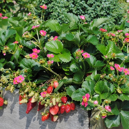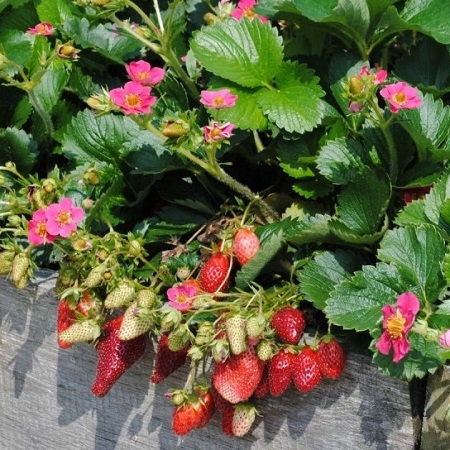 Ремонтантный позднеспелый гибрид, поэтому цветение и плодоношение растений этого сорта продолжается со средины июня вплоть до начала первых осенних заморозков. Становятся особенно красивыми в период массового распускания бутонов, но и после того, как первая волна цветения пойдет на убыль, усыпанные созревающими ягодками кусты выглядят весьма нарядно. Цветы же у этого гибрида воистину великолепные – крупные, насыщенно-розовые и очень душистые. Первые ягоды обычно поспевают в начале-середине июня. Интенсивное цветение и плодоношение продолжаются практически непрерывно в течение всего периода вегетации (около 4 месяцев), на открытом грунте – до осенних заморозков. Ягоды выровненные: крупных и средних размеров (массой до 25-30 г), вытянутой конической или биконической формы, темно-красного цвета, блестящие. Их вкус называют десертным с насыщенной сладостью, которая мало зависит от температуры в период созревания. Гибрид считается высокопродуктивным: урожай формируется не только на материнских кустах, но и на дочерних розетках. Особенности выращивания и ухода: Землянику садовую нужно выращивать на солнечном участке с достаточно легкой слабокислой почвой. Лучше, если он будет защищен от ветра. Участок должен быть чистым от сорняков, особенно многолетних, т.к. бороться с ними на уже засаженном ягоднике практически невозможно. Дополнительные комментарии: Любая клубника, нуждается в подкормке. Процедура должна быть регулярная и дозированная. Клубника сажается двухстрочной грядкой, на расстоянии 25-30см между кустами и 40см между рядами. Мульчей выступает нетканый мульчирующий материал, также солома, опилки или листва кукурузы в осенний период. После высаживания, растение желательно начинать подкармливать через месяц комплексными удобрениями. Повторять процедуру каждые 10-15 дней.