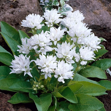 Многолетнее травянистое растение, формирующее компактные кустики высотой 40-60 см. Оно обладает красивыми, темно-зелеными, овальными листьями, собирающимися в розетку у основания. Цветки колокольчатые, белоснежные, собраны в плотные головчатые соцветия, которые возвышаются над розеткой листьев. Цветение обильное и продолжительное, начинается в июне и продолжается до августа.