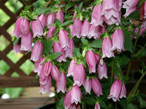 Этот колокольчик очень эффектен благодаря вишнево-розовым цветкам с беловатыми краями и густыми пурпурными точками по лепесткам. Поникающие цветки длиной 3-4 см собраны в густые кистевидные соцветия. Высота 50 см, быстро разрастается.