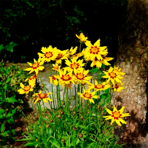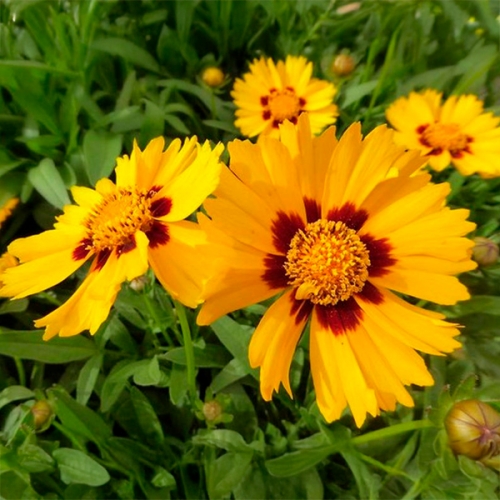 Кореопсис крупноцветковый 'Sun Kiss' – яркий и неприхотливый многолетник, который украшает сад крупными солнечно-желтыми цветами. Этот сорт отличается обильным и продолжительным цветением, а также компактной формой куста. Высота: 30–40 см. Диаметр куста: до 40 см. Цветки: Крупные, полумахровые или простые, ярко-желтые с золотистым оттенком, диаметром 5–7 см. Цветение: С июня по сентябрь, при регулярном удалении увядших соцветий. Листья: Узкие, ланцетные, светло-зеленые. Место посадки: Солнечные участки с хорошо дренированной почвой. Засухоустойчивость: Высокая, подходит для жаркого климата.