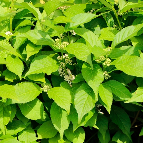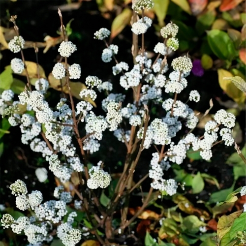 Растение покрывается белыми соцветиями, которые предшествуют главной особенности культуры — белоснежным плодам. Осенью на фоне разноцветной листвы они выглядят особенно эффектно.