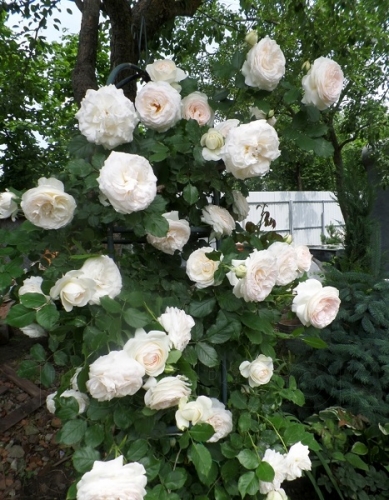 Большой сильный куст, который можно выращивать как плетистую розу, достигает 2,5-3 м в высоту. Цветет все лето кистями цветков, почти непрерывно. Бутоны элегантной формы, желтоватые, иногда с розовым налетом. Аромат насыщенный. Листва ярко-зеленая, блестящая, устойчива к болезням.