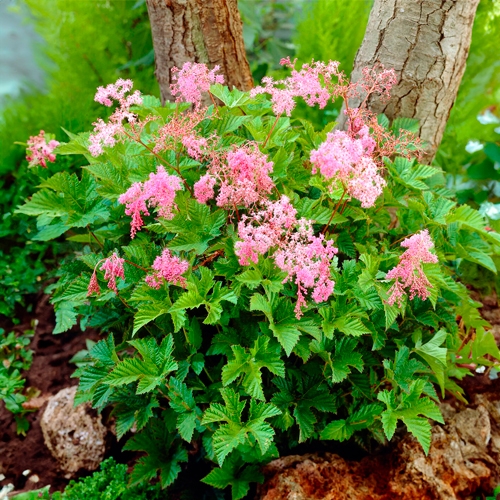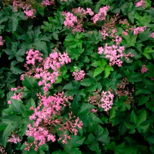 Лабазник гибридный Кахом — это низкорослый многолетник с прямыми маловетвистыми побегами. Высота растения составляет от 30 до 50 сантиметров. У лабазника ярко-зелёные листья, которые имеют прерывисто-перистое строение и крупную верхнюю лопастную долю. В период цветения на концах побегов появляются розовые махровые цветки, собранные в рыхлые метельчатые соцветия. Цветение начинается в июне.