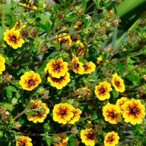Невероятно жизнерадостное растение. Над розеткой слегка пушистых, похожих на клубничные, листьев возвышаются тонкие цветоносы, увенчанные, будто яркими звездочками, желтыми цветками с красной серединкой. Цветение почти бесконечное с июля. Листья зубчатые, зеленые, похожи на листья земляники. Высота растения 40-60 см. Название латинское: Potentilla "Esta Ann" Особенности выращвания и ухода: Несмотря на то, что лапчатка гибридная способна расти и в небольшой тени, для ее выращивания предпочтительно выделять хорошо освещаемые солнцем участки, с питательной, некислой почвой супесчаного типа. При поливе растения главное - не перестараться. Использование: Прекрасно смотрятся в цветниках и отделными групами среди газона